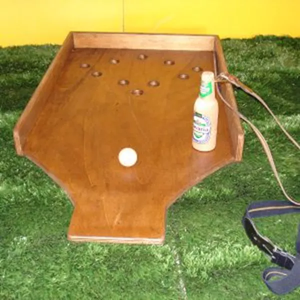 4. Probeer met het houten bierflesje (welke tussen uw benen hangt) de bal naar de gaten te verplaatsen.