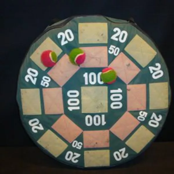 Set bestaat uit een kussen voorzien van klittenband en vakverdeling en 3 balletjes voorzien van klittenband.
