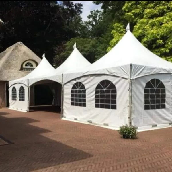 - De Pagodetenten zijn aan elkaar te koppelen en te worden voorzien van goedjes zodat de overgang waterdicht is.