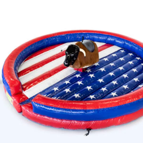 - Je zet de Rodeostier gemakkelijk binnen 20 minuten op. Bijvoorbeeld tijdens een zeskamp, sportdag of ander feestelijk evenement. De valmat in USA thema wordt in één deel geleverd en is daardoor gemakkelijk te transporteren. Inclusief blower, verankeringsmateriaal, transportzak, en een duidelijke handleiding.