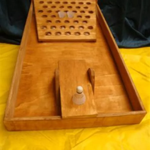 Sla, niet al te hard, op het plankje en mik in de gaten.