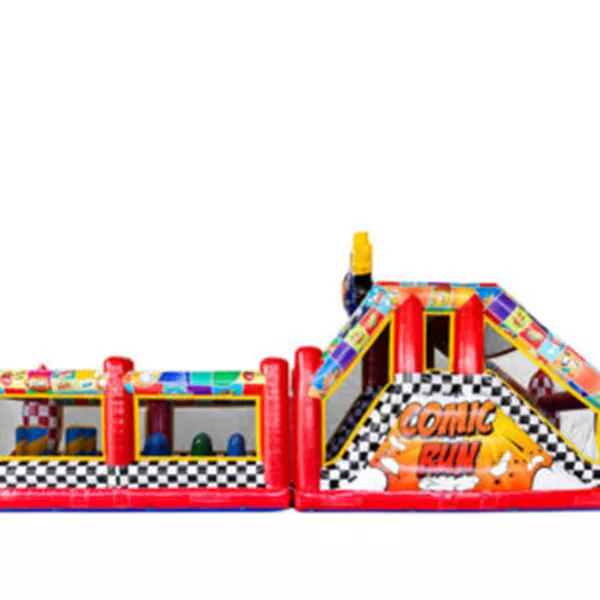 Indrukwekkende 17 meter lange Comic Stormbaan! Deze opblaasbare hindernisbaan, uitgevoerd in levendig stripboekthema, biedt deelnemers een nóg grotere uitdaging met meer ruimte om te rennen, springen, klimmen en glijden. De Comic Run maakt elk sportevenement, bedrijfsuitje of kinderfeest tot een gegarandeerd succes. Wie durft het op te nemen tegen de uitdagende obstakels en de supersnelle glijbaan?