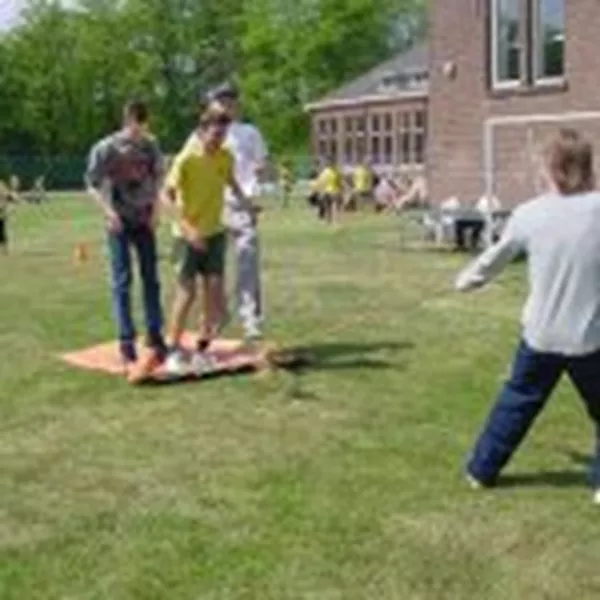 1 persoon trekt terwijl de andere ploeggenoten opspringen.